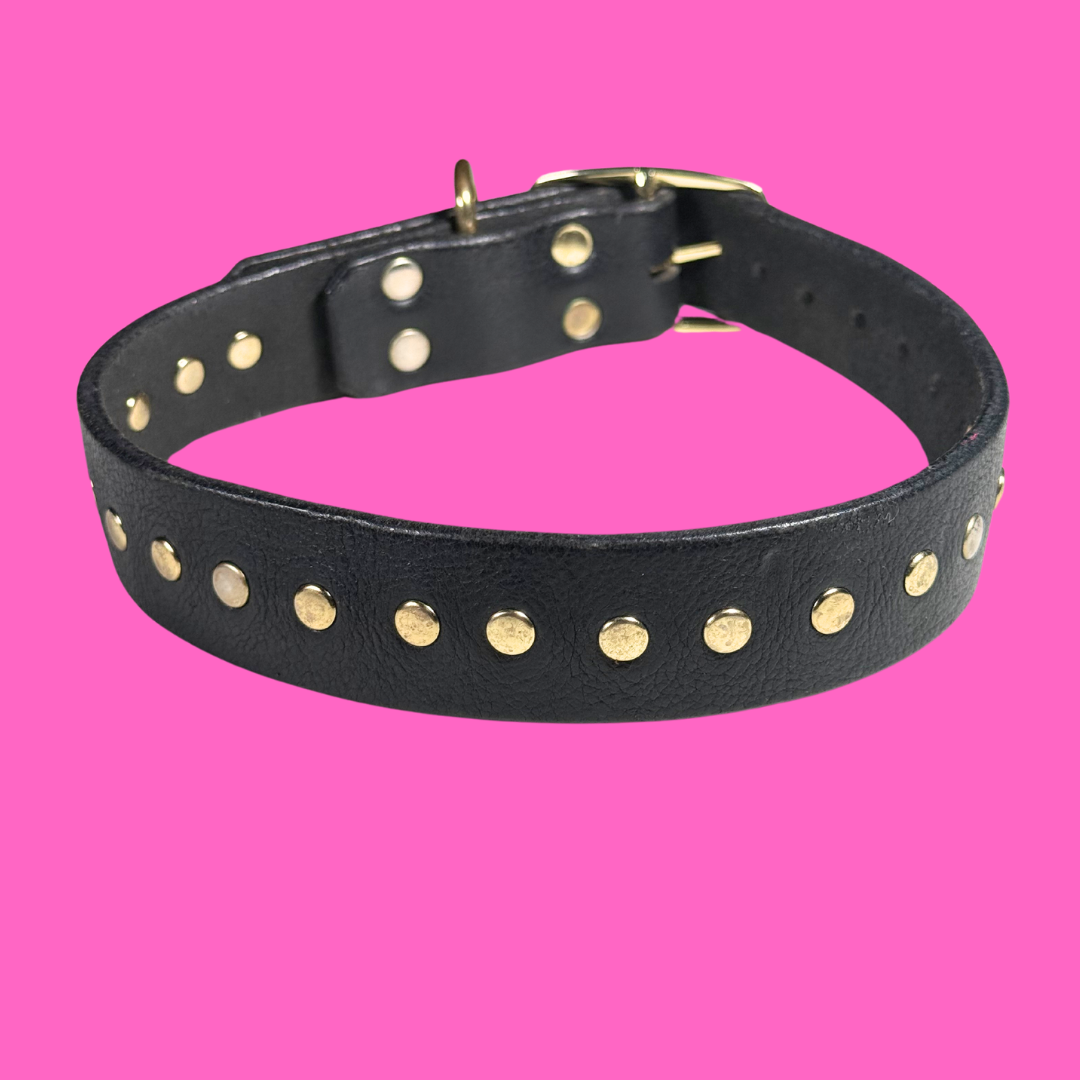 Sleek, dark, and dipped in shine—the Midnight Gold Drip Collar is all about subtle flex with bold intention. Black leather and gold rivets never looked so cold.