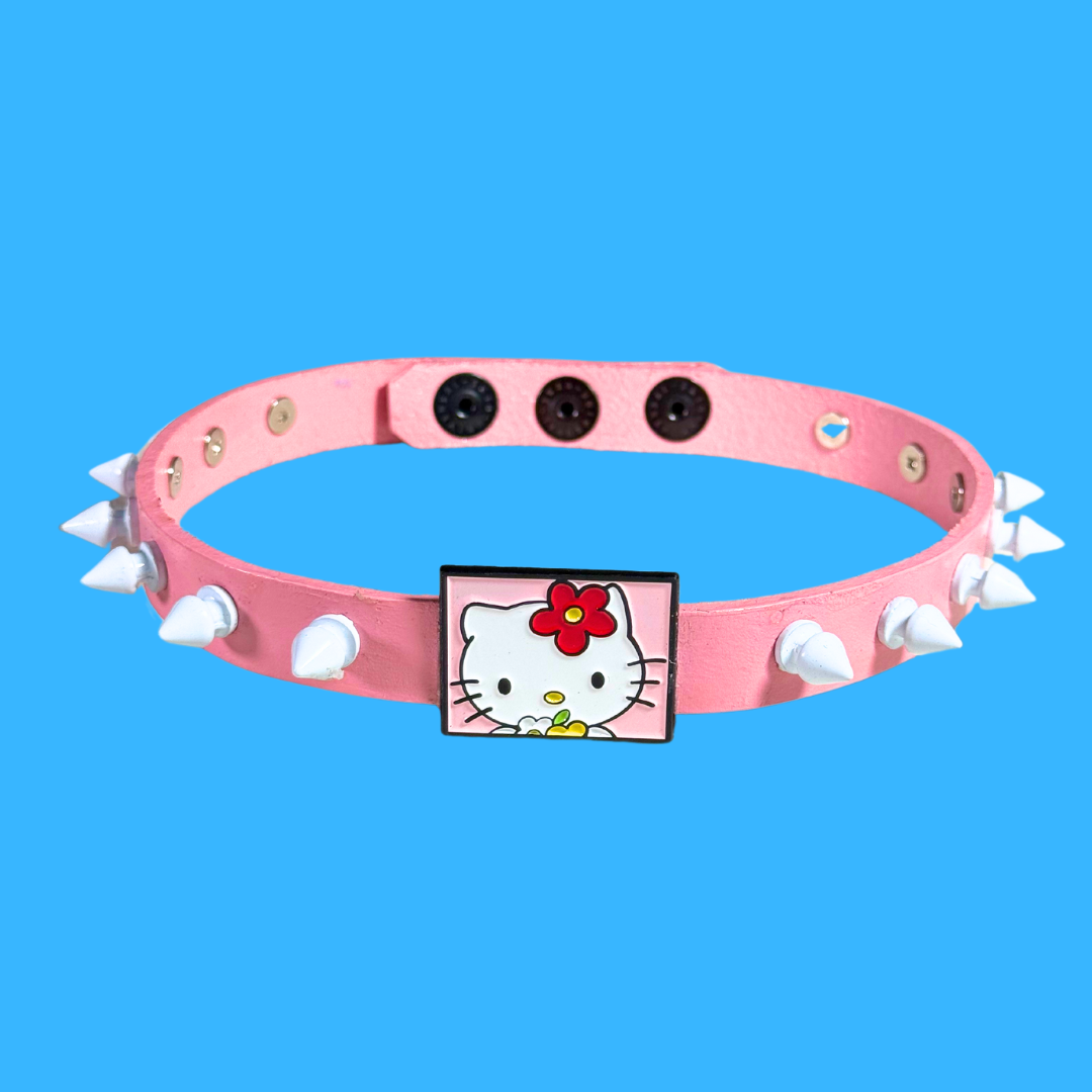 This light pink choker blends soft nostalgia with sharp attitude—featuring clean white spikes, matte black snaps, and a bold Hello Kitty charm front and center. Sweet on the surface, savage underneath.
