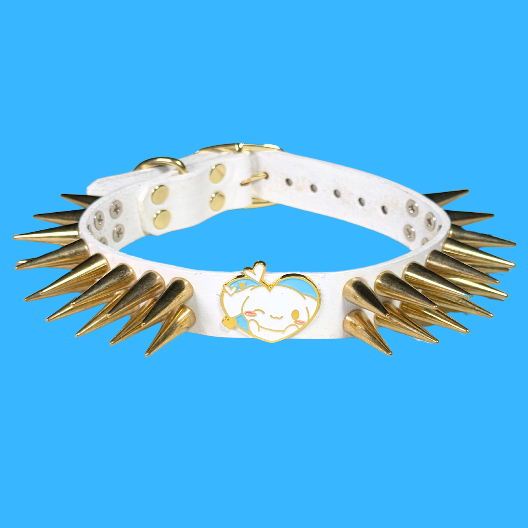 Cute from the front, sharp underneath—Sugar Halo plays angel, but never hides the edge. White leather, gold spikes, and a blushing Cinnamonroll charm serve soft power with a wink.