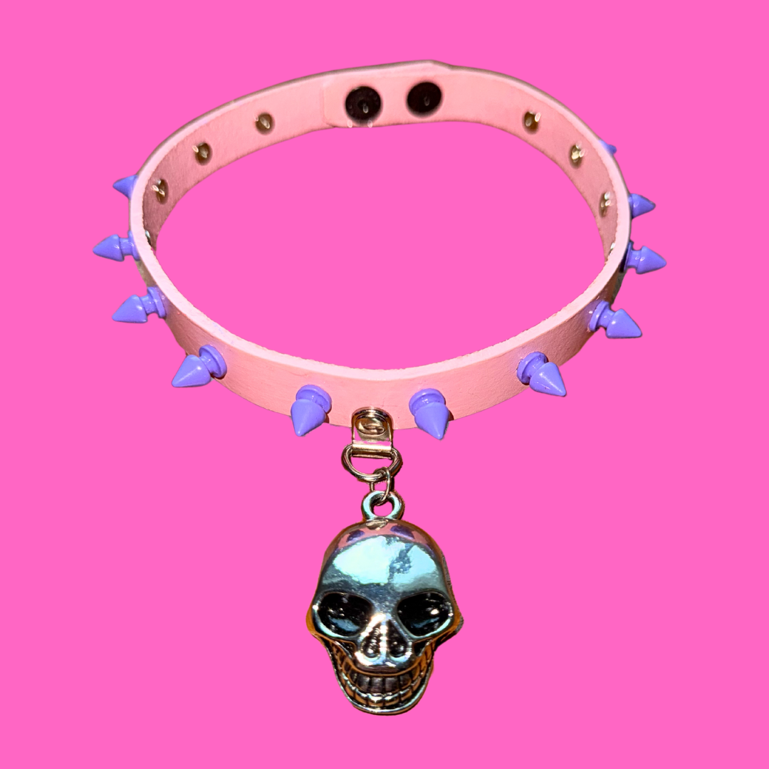 A little pastel, a little menace—Sugar & Spite serves cute with a side of chaos. Lavender spikes, soft leather, and a silver skull that says “try me.”
